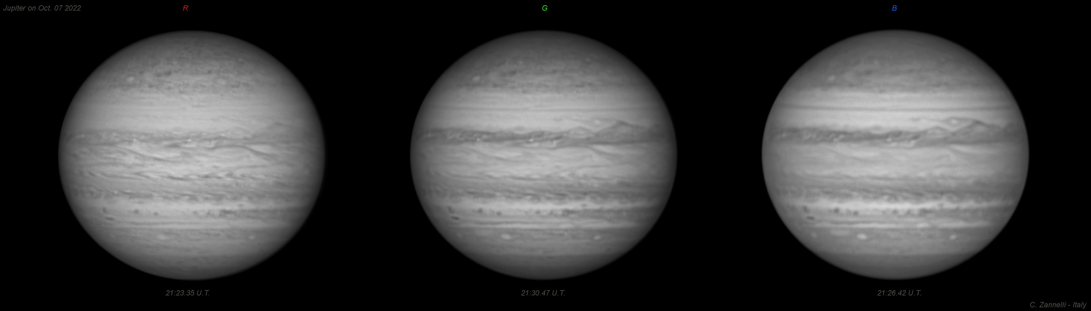 After a very long absence (about 4 and a half years) from my personal Jupiter capture, mainly due to its low height above the horizon @ our latitudes, here is finally a new image of the giant planet, which portrays it just as it presents itself in these days of October 2022, on the areas almost opposite to the side where the Great Red Spot is located.